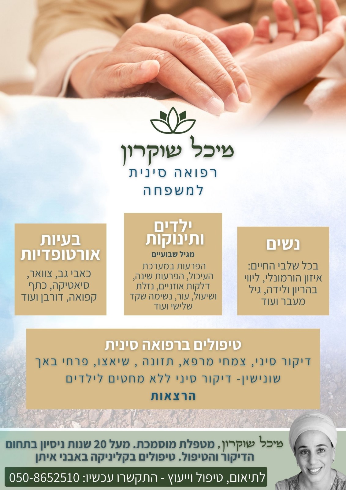 מיכל שוקרון- רפואה סינית למשפחה רפואה סינית בגישה של גוף נפש נשמה. עם נסיון משנת 1999, אני מלווה נשים בגל מעגלי החיים , תינוקות, ילדים ואנשיםבתהליכי ריפוי אישיים- בגוף ובנפש.